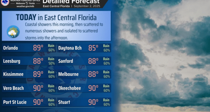 Skies will be partly to mostly cloudy and rain chances are at 60 percent across most of Central Florida, according to NWS Melbourne.