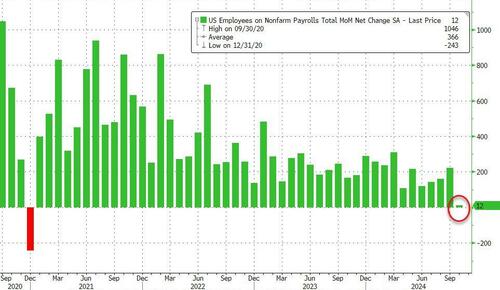 In our nonfarm payrolls preview last night, we said that the October payrolls report may show the first negative print since 2020. Well, moments ago the BLS reported the highly anticipated number and… it was close: the monthly print was only 12K, a huge drop from the pre-revision 254K in October (revised naturally lower to 223K), and just 13K away from a negative print.