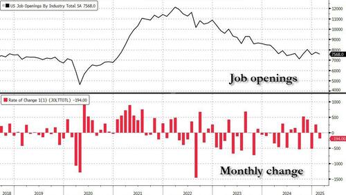 It’s possible that after surprising the market last month when we saw one of the a sizable increase in the number of job openings, Trump got the tap on the shoulder that the US market should probably continue shrinking slowly but surely, if his plan is to (still) blame Biden for any imminent recession, and so he sent a memo to the BLS to make sure that the numbers aren’t in freefall, but dropping more gradually.