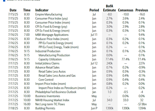 08:30 AM PPI final demand, June (GS +0.1%, consensus +0.2%, last +0.1%); PPI ex-food and energy, June (GS +0.1%, consensus +0.2%, last +0.1%); PPI ex-food, energy, and trade, June (GS +0.1%, consensus +0.2%, last +0.1%)