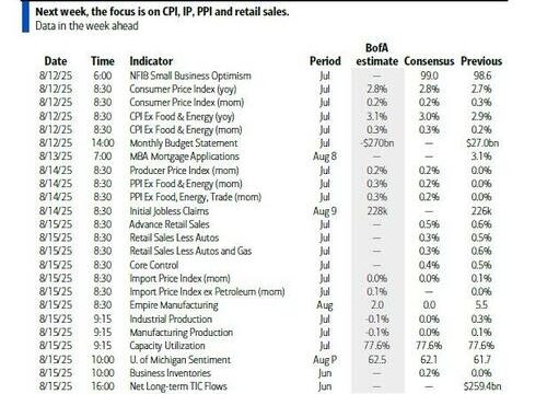 As we move into mid-August, markets are bracing for a surprisingly busy week, with several key events and data releases likely to shape sentiment; of these, the most closely watched will be tomorrow’s US CPI report, which after the last week of July which had both the jobs report and the Fed meeting, could prove to be one of the larger events of the summer for markets, according to Deutsche Bank’s Peter Sidorov.