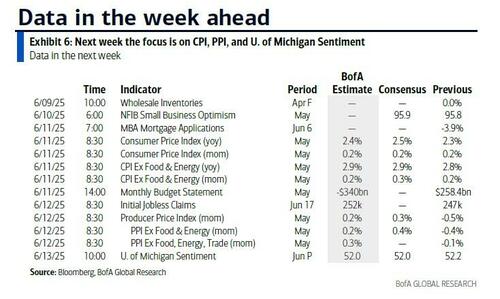 Finally, looking at the US, Goldman notes that the key economic data releases this week are the CPI report on Wednesday and the University of Michigan report on Friday. Fed officials are not expected to comment on monetary policy this week, reflecting the blackout period ahead of the June FOMC meeting.