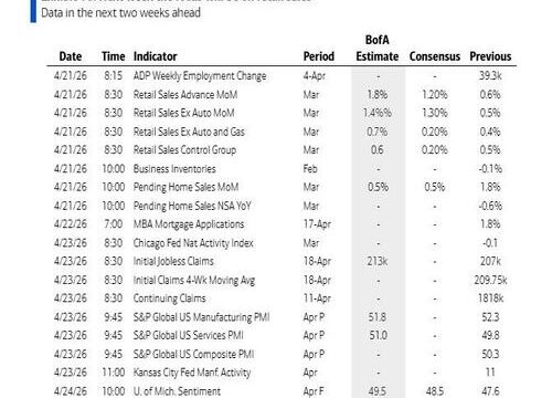 Finally, looking at just the US, Goldman writes that the key economic data release this week is the retail sales report on Tuesday. Fed officials are not expected to comment on monetary policy this week, reflecting the blackout period ahead of the May FOMC meeting. Fed Chair nominee Kevin Warsh will have his nomination hearing on Tuesday.