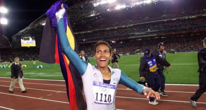 SÍDNEY (AP) — Cathy Freeman emocionó a los australianos cuando ganó la medalla de oro en los 400 metros femeninos en los Juegos Olímpicos de Sídney 2000, vistiendo un traje de correr ajustado con capucha. Luego generó controversia al dar una vuelta de victoria llevando la bandera australiana y una bandera que representa a los pueblos originarios de Australia.