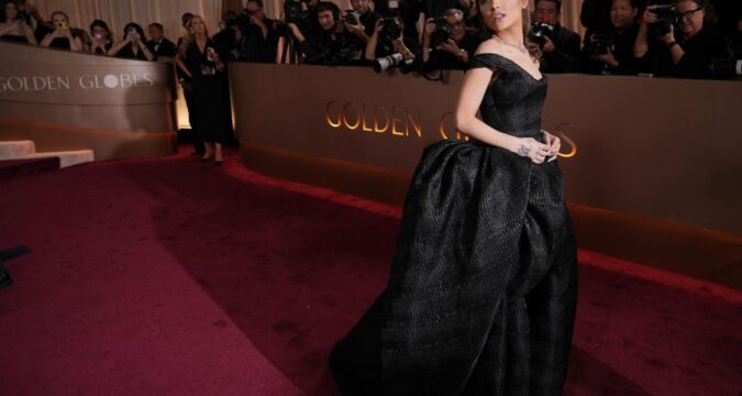 Ariana Grande se despidió del rosa de su personaje Glinda en “Wicked” y optó por un vestido de gala negro voluminoso el domingo para los Globos de Oro.
