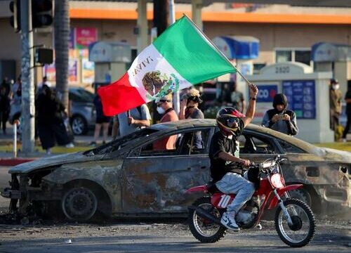 The masked man on the motorcycle, the one who waved a Mexican flag in front of a torched car as Los Angeles police stood by, will soon be famous. His identity remains unknown, his image iconic – but for all the wrong reasons.