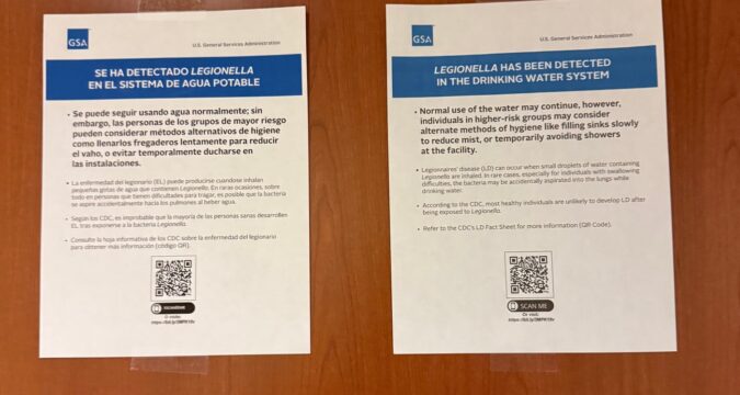 The warning notices posted in English and Spanish at the courthouse include a link to a federal Centers for Disease Control and Prevention bulletin outlining the risks of Legionella. In bold type, the notices say, “Normal use of the water may continue, however, individuals in higher risk groups may consider alternate methods of hygiene like filling sinks slowly to reduce mist or temporarily avoiding showers at the facility.”