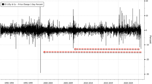 In markets, Lilly shares in New York plunged as much as 12% in premarket trading. If the losses hold through the cash session, sustaining at least a 12.35% decline (last seen on Oct. 9, 2008), then it would mark the largest single-day drop since the 29% crash on August 9, 2000.