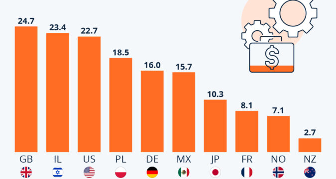 But, as Statista’s Katharina Buchholz reports, in the United States, this number was not much lower at 22.7 percent. Another low-wage country identified in the figures was Israel.