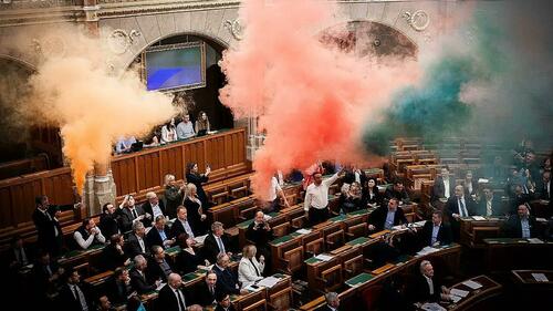 Far left extremists protested the passage of the measure in the Hungarian parliament by screeching whistles and generally freaking out. They had previously set off smoke bombs inside the parliament.