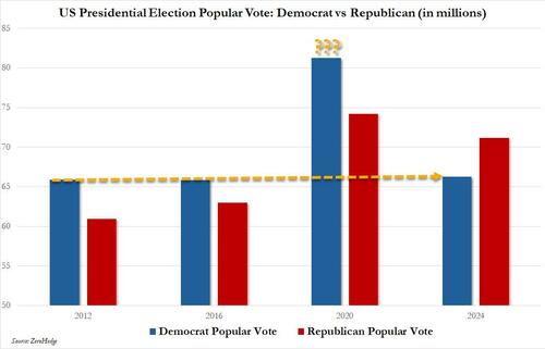 Trump won in 2016, he also won in 2020 (but it was stolen from him thanks to 20 million “vapor” votes which magically failed to make a re-appearance in 2024), and he just won again in a landslide, not just the electoral but the popular vote as well… and boy are markets rocking!