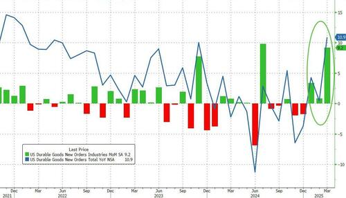 US Durable Goods Orders printed a massive 9.2% MoM surge in preliminary March data, massively beating the +2.0% MoM expectation) and pulling orders up 10.9% YoY – the highest since Jan 2022. This is the third straight month of strong orders…