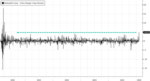 McDonald’s global same-store sales increased by .4% in the fourth quarter (this snapped two consecutive negative quarters), offsetting a 1.4% decline in the US, where cash-strapped consumers and an E. coli outbreak weighed on Big Mac demand. Shares in New York jumped on Monday as executives forecasted an improving sales trend for 2025.