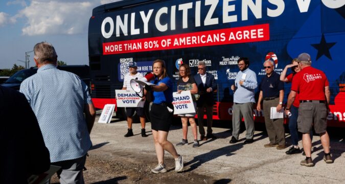 The residents stood in front of a tour bus, wrapped in political messaging that read “only citizens vote” and “more than 80% of Americans agree,” at its latest stop on a three-week tour from California to Washington, with national Republican advocates pushing for the passage of a bill to require proof of citizenship for voting.