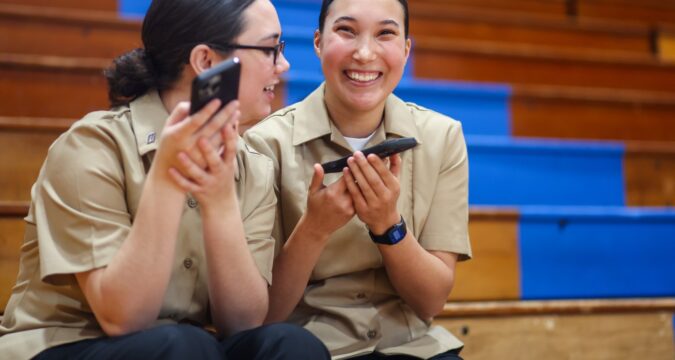 A couple hours into the morning, almost every recruit was deep into conversation with loved ones or friends. Some walked and talked with their phones, some searched for a quiet spot, others sat shoulder to shoulder introducing their families to each other, and some just sunk into the bleachers, smiling gently at the screen.