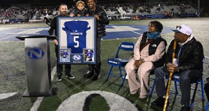 Jahan Dotson is honored during a Nazareth Area High School football game as the school retires his number Friday, Oct. 10, 2025, in Nazareth.