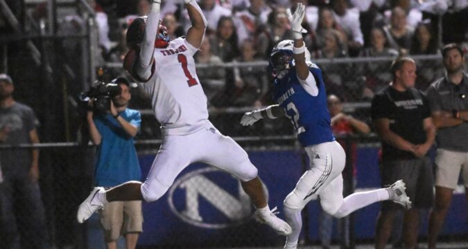 Parkland’s T.J. Lawrence makes the catch to score Friday Sept.18, 2025, against Nazareth at Nazareth High School.(Amy Shortell/The Morning Call)