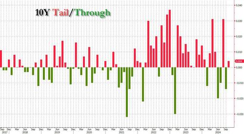 The auction stopped at a high yield of 4.066%, up sharply from last month’s 3.648% (which was the lowest since May 2023), and tailed the When Issued 4.062% by 0.4bps, a big reversal from last month’s 1.4bps through auction (but nowhere near as bad as the 3.1bps tail in August).