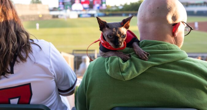 On Wednesday, fans were encouraged to bring cat and dog food donations for a pet pantry food drive. Cats were required to remain on a leash or in a carrier or backpack while in the stadium, and owners, the Tides said in a promo, were responsible for their cat’s waste.