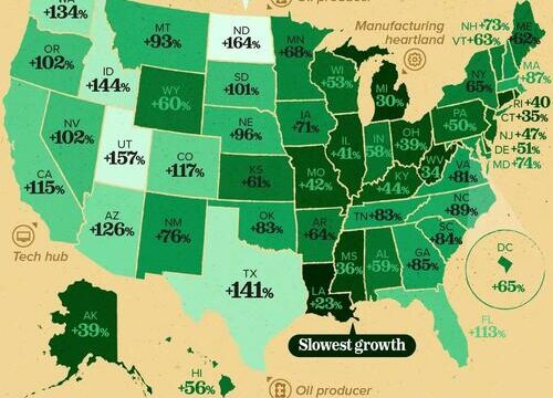 The visualization, via Visual Capitalist’s Pallavi Rao, ranks all 50 states and the District of Columbia by inflation-adjusted GDP growth between 1998–2024.