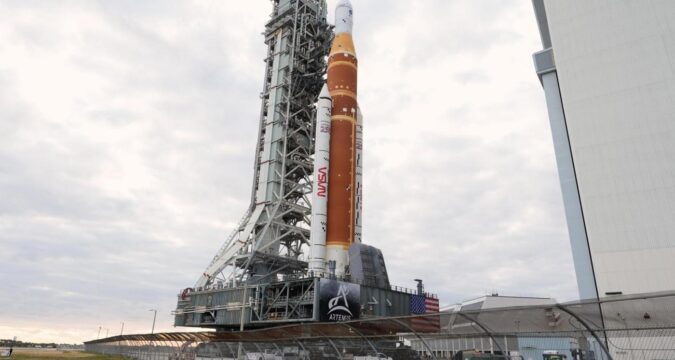 El cohete de 98 metros (322 pies) comenzó su lento avance de 1,6 km/h (1 mph) desde el Edificio de Ensamblaje de Vehículos del Centro Espacial Kennedy al amanecer. La travesía de 6 kilómetros (4 millas) podría durar hasta el anochecer.