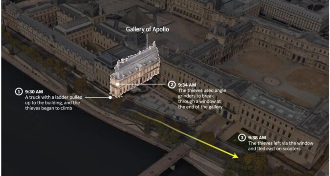 Sunday’s theft focused on the gilded Apollo Gallery, where the Crown Diamonds are displayed. Alarms brought Louvre agents to the room, forcing the intruders to bolt, but the robbery was already over.
