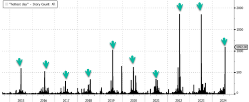 Bloomberg data shows that headlines featuring the ‘hottest day’ ever in corporate media soared this month. This spike in climate doom headlines is an annual occurrence in July for the Lower 48.