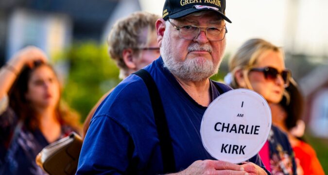 Rodger Gilbert of Bethlehem Township holds a sign he made Thursday, Sept. 18, 2025, outside Northampton County Courthouse in Easton against comments critical of slain conservative activist Charlie Kirk allegedly made by Northampton County Council member Kelly Keegan. (April Gamiz/The Morning Call)
