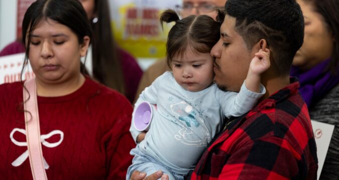 Rafael Veraza and Evelin Herrera hold their 1-year-old daughter, Arinna Sofia Veraza, on Nov. 9, 2025, in Chicago’s Little Village neighborhood. (Brian Cassella/Chicago Tribune)