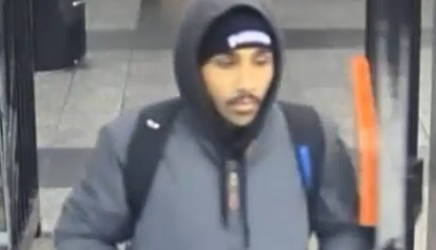 MTA surveillance cameras show the suspect wearing a grey jacket, black hat, black pants, black boots and carrying a black backpack inside a city subway station.