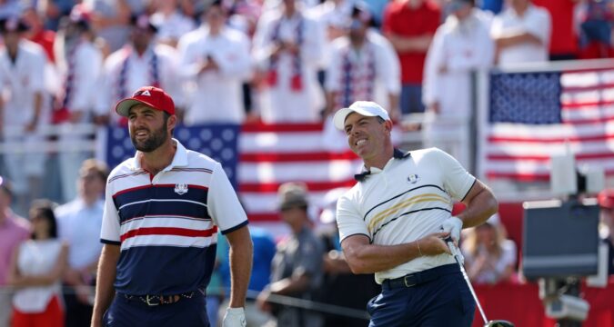(L-R) Scottie Scheffler of Team United States and Rory McIlroy of Team Europe react from the first tee during the Sunday singles matches of the 2025 Ryder Cup at Black Course at Bethpage State Park Golf Course on Sept. 28, 2025, in Farmingdale, New York.