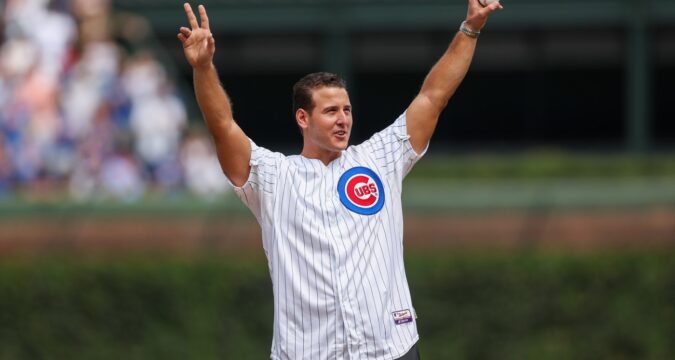 Former Cubs first baseman Anthony Rizzo throws a ceremonial first pitch before a game against the Rays on Saturday, Sept. 13, 2025, at Wrigley Field. (Armando L. Sanchez/Chicago Tribune)