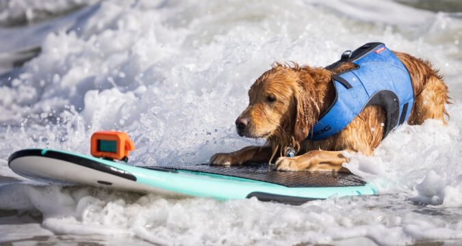 Charley, a rescued golden retriever, would win the solo category with a combination of wave size, ride length, and confidence on the board. Fay, a chihuahua, won the tandem category with owner Ben Hagerty.