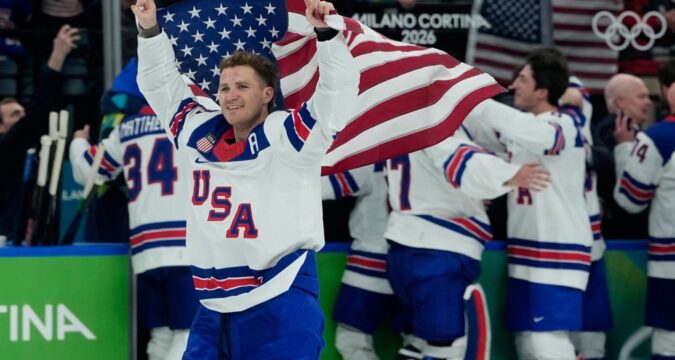 The United States celebrates winning during a men’s ice hockey gold medal game between Canada and the United States at the 2026 Winter Olympics, in Milan, Italy, Sunday, Feb. 22, 2026.