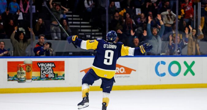 Norfolk forward Jack O’Leary scored the game winning goal in overtime to lift the Admirals over the Fort Wayne Komets 5-6 at Scope Arena in Norfolk, Va., on Feb. 20, 2026.