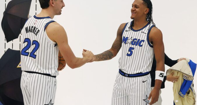 Orlando Magic forwards Franz Wagner, left, and Paolo Banchero (5) are pictured during Orlando Magic Media Day at the AdevenHealth Training Center on Monday, September 29, 2025. (Stephen M. Dowell/Orlando Sentinel)