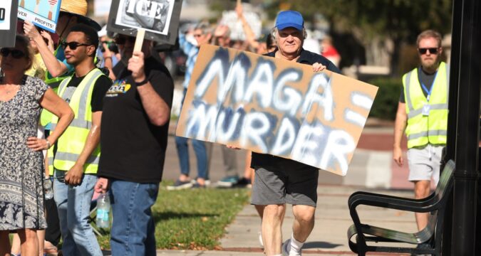A protestor holds a sign during a “Ice Out for Good” Protest Rally at Triplet Lake Drive in Casselberry on Saturday, January 10, 2026. The Seminole County Democratic Party organized the event to protest the ICE actions in Minneapolis, resulting in the death of Renee Nicole Good. About 75 people participated in the event. (Stephen M. Dowell/Orlando Sentinel)
