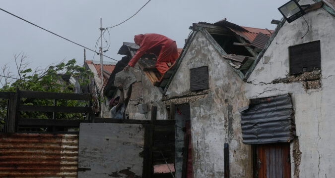 Men remove a loose section of roof in Kingston, Jamaica, as Hurricane Melissa approaches, Tuesday, Oct. 28, 2025. (AP Photo/Matias Delacroix)