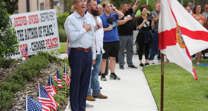 Attendees recite the Pledge of Allegiance during a prayer vigil for Charlie Kirk at the Historic Lake County Courthouse in Tavares on Thursday, September 11, 2025. Charlie Kirk, a prominent conservative activist, was assasinated in Utah on Wednesday, September 10, 2025. (Stephen M. Dowell/Orlando Sentinel)