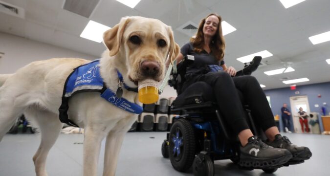 Nutmeg picks up a pill bottle from the floor for Shelly Daniels — Service dogs demonstrate their skills during an event to celebrate National Service Dog Month at Canine Companions, on Friday, September 19, 2025. (Ricardo Ramirez Buxeda/Orlando Sentinel)