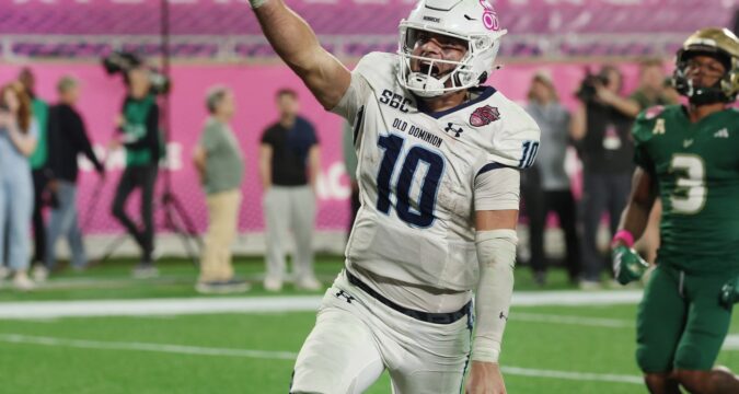 Old Dominion quarterback Quinn Henicle (10) celebrates with teammates after a first down during the Cure Bowl game of University of South Florida vs. Old Dominion University at Camping World Stadium in Orlando on Wednesday, December 17, 2025. Old Dominion won the game 24-10. (Stephen M. Dowell/Orlando Sentinel)