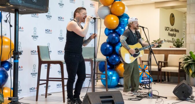 Singer Brent Smith and guitarist Zach Myers of the rock band Shinedown perform at UCF Lake Nona Hospital as part of a launch announcement for Musicians on Call on Oct. 14, 2025. The nonprofit organization has a bedside program that brings volunteer musicians to patients in hospitals. Shinedown donated $300,000 raised from their recent tour to the organization. (Patrick Connolly/Orlando Sentinel)