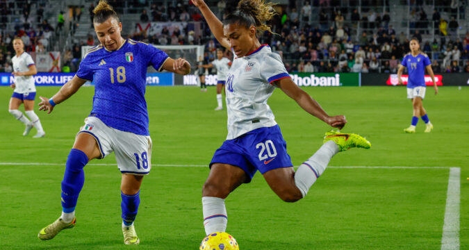 US Women’s National Team midfielder Alyssa Thompson takes a shot toward the goal while Italy defender Valentina Bergamaschi attempts to deflect the shot during the US Women’s National Team vs. Italy match at Inter&Co Stadium on Friday, November 28, 2025. (Rich Pope/Orlando Sentinel)
