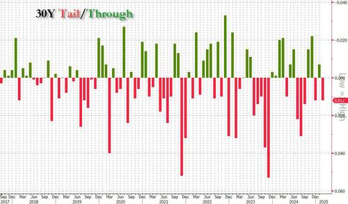 A stellar 3Y auction, followed by a mediocre 10Y, we conclude the refunding week’s coupon offerings with an even more disappointing 30Y sale, which saw $25 billion in ultra long-dated paper sell to muted market response.
