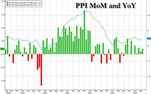 Starting at the top, headline PPI rose 0.2% MoM (in line with the +0.2% expected) but September was revised higher from 0.0% to 0.1%; meanwhile on an annual basis, headline PPI rose 2.4%, higher than the 2.3% expected, with the last month also revised higher from 1.8% to 1.9%.