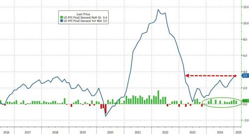 Following yesterday’s hotter than expected surge in consumer prices, all eyes are on producer prices this morning as headline PPI rose 0.4% MoM (more than the 0.3% exp) in January, but December’s 0.2% MoM rise was revised dramatically higher (to +0.5% MoM). Between the hot headline and upward revisions, headline PPI rose 3.5% YoY (+3.3% exp) – the hottest PPI since Feb 2023…