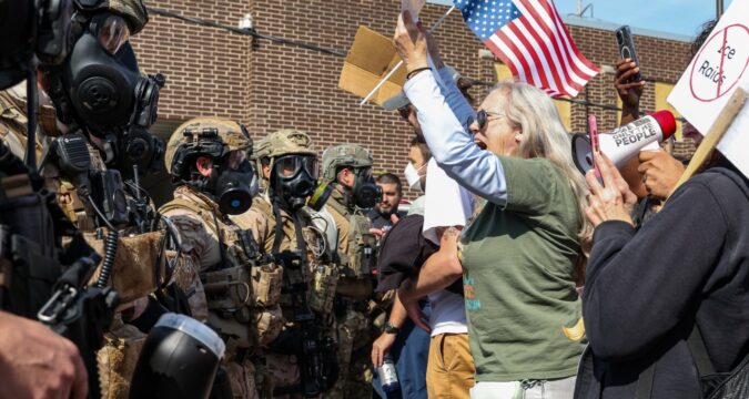 During part of the morning protests, a robotic voice repeated to protesters: “It is hereby declared that you are obstructing and impeding federal law enforcement officers in performance of their official duties, in violation of federal law. You are commanded to immediately disperse. If you do not do so, you may be arrested or subject to other police actions,” before later going on to warn that “other police action” could include “chemical or less lethal” weapons that posed the risk of “serious injury.”