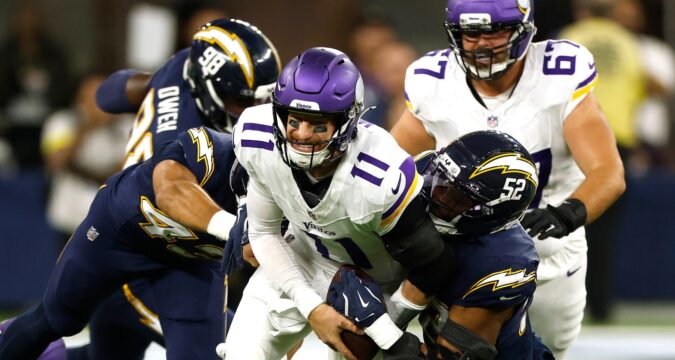 Wentz’s rough night only got worse when he overthrew Justin Jefferson early in the fourth quarter and the Chargers’ RJ Mickens came away with the interception. With 6:19 remaining, the Vikings turned the ball over on downs after Wentz was hit from behind by the Chargers’ Troy Dye, and the veteran QB sprinted off the field holding his left arm against his body.