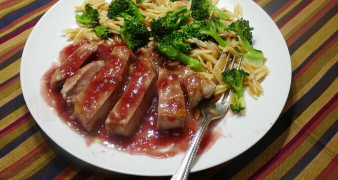 I came across bottled sangria at the market and was inspired by its fruity, spiced notes—perfect for pairing with tender pork loin chops. The sangria adds a subtle depth of flavor that complements the savory richness of the meat. To round out this early fall dinner, orzo, a rice-shaped past, is simmered with broccoli florets, making a quick, colorful side dish.