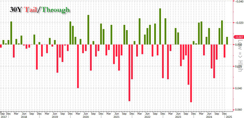 After two dismal coupon auctions to start the week, and the year, the final sale of Treasury paper in the funeral-shortened week took place shortly after 1pm when the Treasury sold $22BN in a 29 Year, 10 Month reopening, in what was the strongest auction so far in 2025.